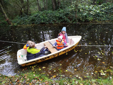 Anschließend ging es weiter zu einem kleinen, ganz versteckt liegenden Teich auf dem die Kinder mit Booten fahren konnten. Ruder suchten sie allerdings vergeblich, um vorwärts zu kommen mussten sie sich an Seilen entlang hangeln - ein schwieriges Unterfangen, aber mit der Zeit klappte es immer besser.